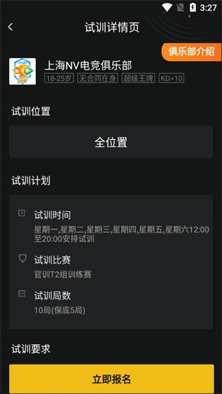 4、用户如果中意该俱乐部,用户可以点击立即报名,等俱乐部来安排试训比赛;