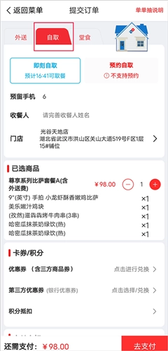 1、首先打开美乐比萨,先选择好美食,在下单界面选择“自取”填写预留手机号和收餐人,支付即可再下单门店进行自取。