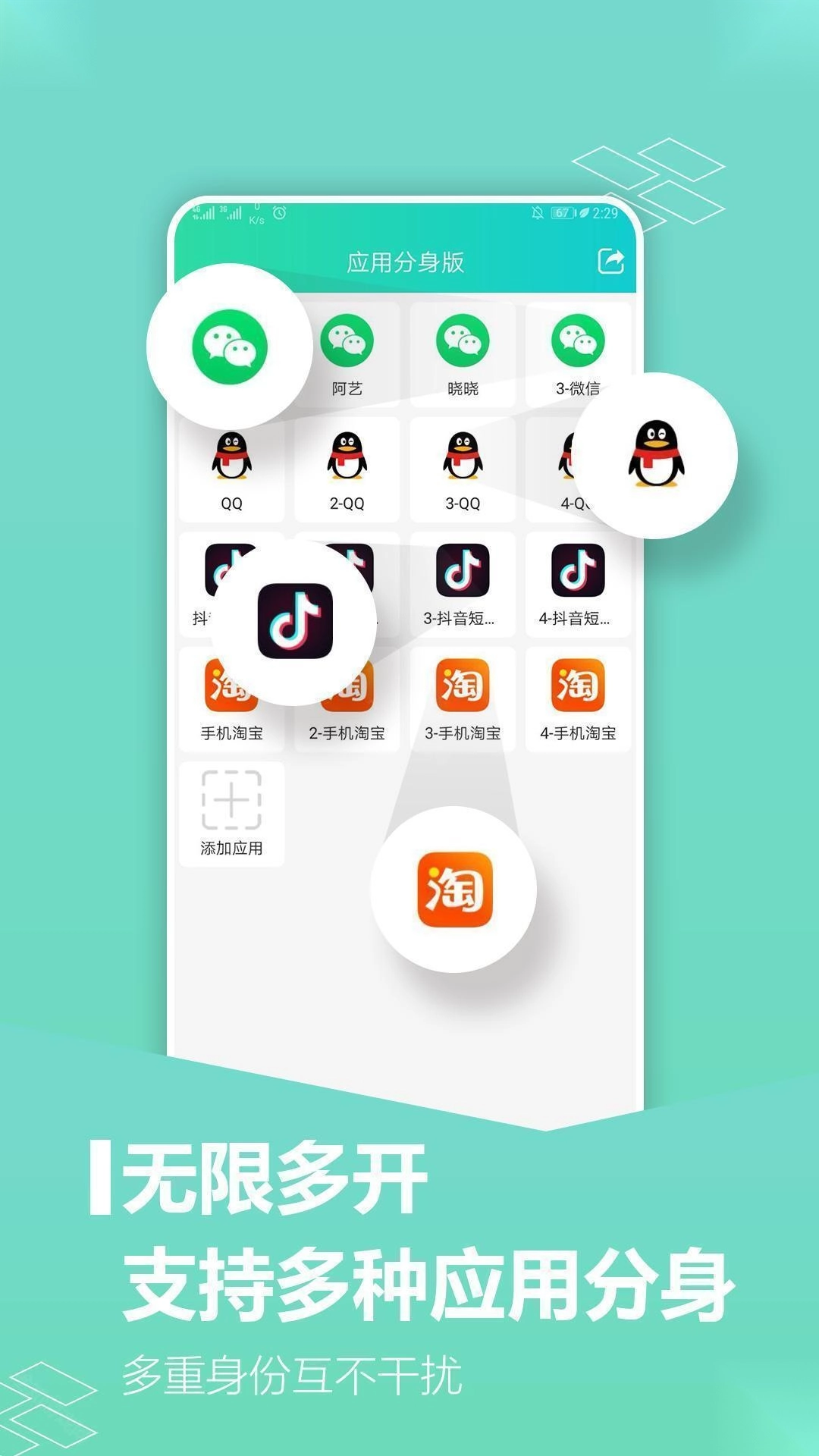 1、这款软件体积小巧,不会占据过多存储空间,也绝无可能对运行效率造成影响。 2、它能够实现近乎所有应用的多开分身功能,堪称完美地解决了用户多账户同时在线的需求。