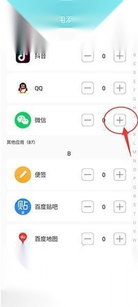 2、在添加页面中,点击微信右侧的【+】按钮,数量由你选择。