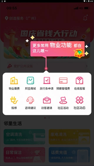 在线预约维修服务,社区公告随时可查,省时省力!聊天还能挣物业费,邦豆抵扣优惠多多,省钱有道!