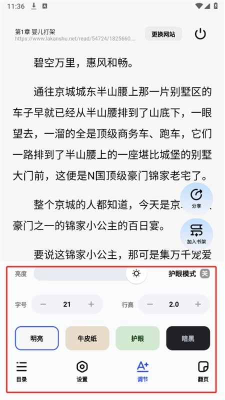 4、进入阅读界面后,可以根据阅读习惯调整字体的大小、背景等设置