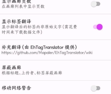 2、如果想要将标签全都设置为中文的话,可以在EHviewer中打开设置,然后点击打开“补充翻译”。