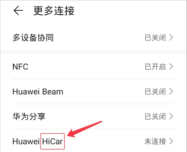若要确认是否支持HiCar手机互联功能,可打开手机中的“设置”,接着进入“更多连接”。若在此页面看到“Huawei HiCar”或者“HiCar智行”,则表明该手机支持此功能,具体页面展示如下图: