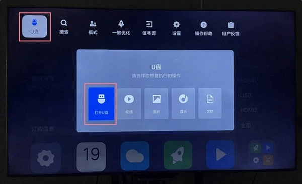 把 U 盘插入电视,当出现弹窗时,选择“打开 U 盘”选项。要是没有弹出该弹窗,那么在电视首页的最顶端,按下“上”键,就能找到 U 盘。