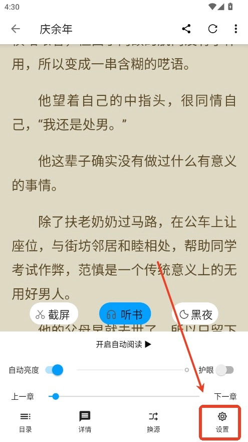 1.进入一本小说后点击右下角设置按钮。