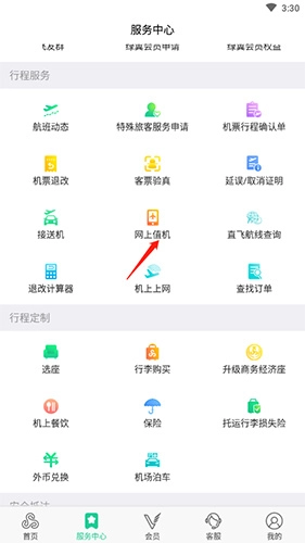 2. 来到服务中心页面,点击“网上值机”选项。若你已购买机票,便能开展值机操作。