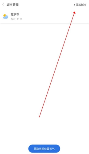 2、大家看天气时,肯定都想了解自己所在城市的天气状况。这时,只需点击【添加城市】,就能添加自己所在的城市。要是想看其他某个地方的天气,同样可以通过这个操作来实现。