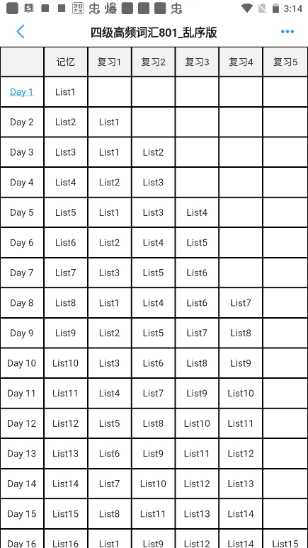 答:每日的学习由“记忆”与“复习”两部分构成,Day2中包含List2记忆以及List1复习,当这两项都完成“打卡”后,顶部的向右箭头便能够点击,从而切换至Day3。