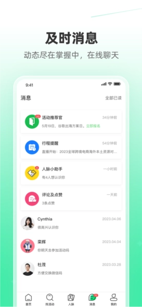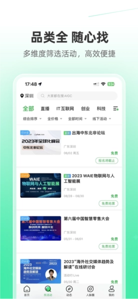 3、人脉圈:精英汇集,随时关注同行动态、热门会议和线下活动,透过活动构建人脉。