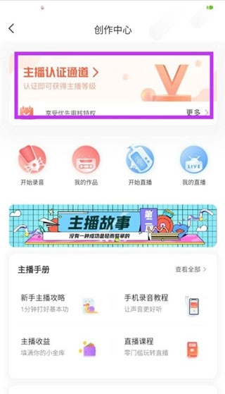 3、进入创作中心后,页面里有一个主播认证通道,进入通道;