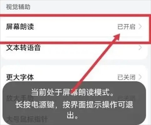 方法一:长按电源键 若您的华为手机触发了触屏说话功能,可尝试长按手机电源键。持续按压后,手机屏幕会出现屏幕朗读关闭的提示界面。看到此界面时,双指长按屏幕3秒以上,系统便会快速退出朗读模式。
