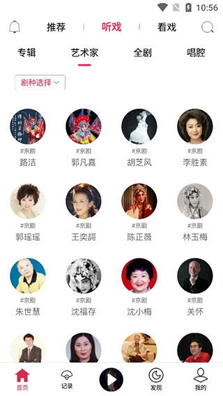 2、应用中还有按照唱腔和艺术家分类的列表,其中一共涵盖京剧、豫剧、黄梅戏、评剧、川剧等全国50多种戏曲唱腔。