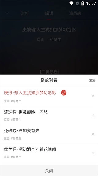5、当你点开播放列表时,同一剧目下的其他唱段会自动弹出。例如,此刻正在聆听的是《庚娘·想人生犹如那梦幻泡影》。