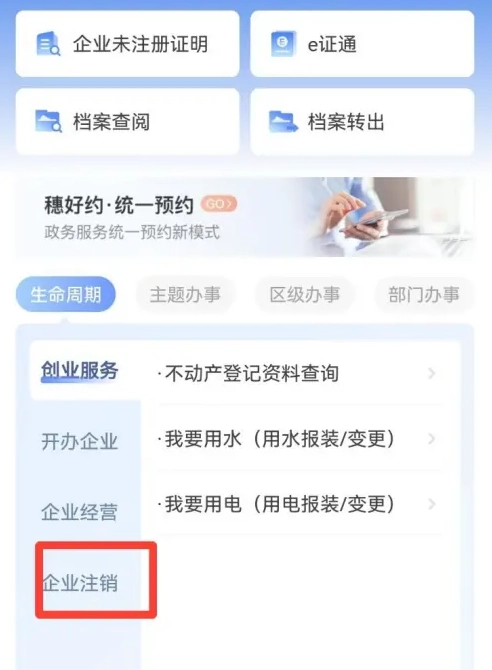 2. 在企业办事页面,点击【企业注销】选项。