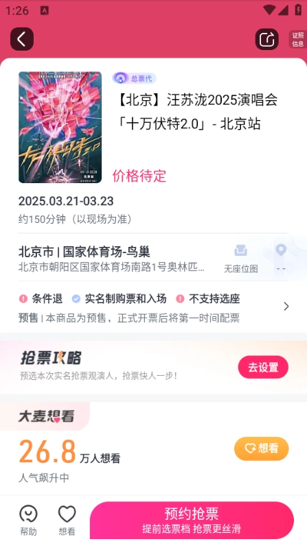 3、仅需点击预约抢票,随后等待门票开售即可。