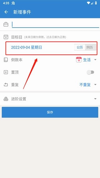 3、随即能够进入新增事项的页面,在此页面输入事项名称,并选择事项目标日期。