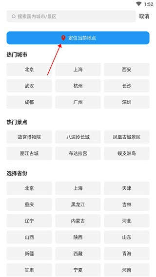 1、首次打开软件,系统会自动完成定位,当然您也可以手动选择地点