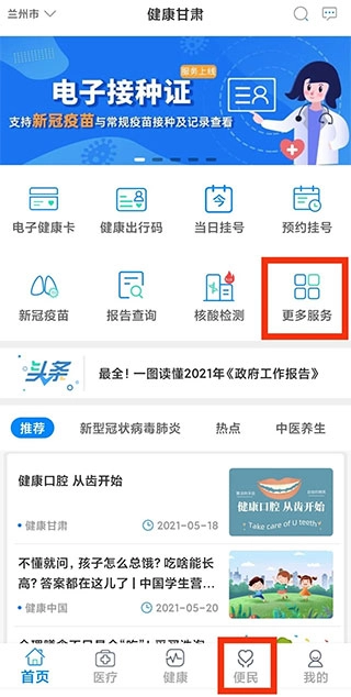 1. 打开“健康甘肃”,选择点击“更多服务”。