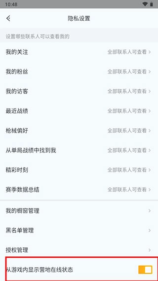 4、最后关闭“从游戏内显示营地在线状态”即可。