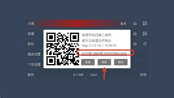 4、将上方提供的接口复制其中后点击确定后重新启动即可(推荐:http://cdn.qiaoji8.com/tvbox.json)