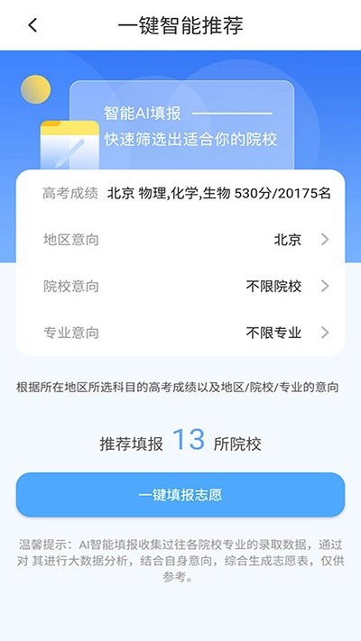 5、再点击下方的【AI智能填报】按钮,完成各项意向即可模拟志愿填报。