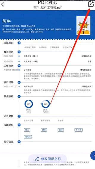 6、导出已完成,用户可在右上角选择分享来查看简历。