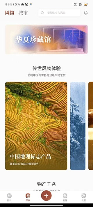 2、探索界面主要划分为两大板块。在“风物”板块,你能够看到中国地理标志产品、世界遗产在中国的分布情况以及国之重宝等内容,尽情体验传世风物的魅力。而在“城市”板块,你既可以标记并分享自己的家乡,也能够探寻特定地理位置的风物。