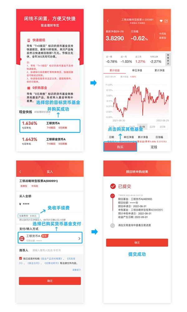 (3)要是打算用货币基金转购其他基金(其中涵盖非货币基金),以工银战略转型股票A(000991)来说,能够直接进入工银战略转型股票A(000991)基金详情页面,并点击购买。