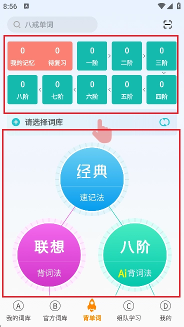 4、登录成功后,背单词界面提供从1阶至8阶全阶段的单词学习内容,同时还有经典及联想背单词方法。