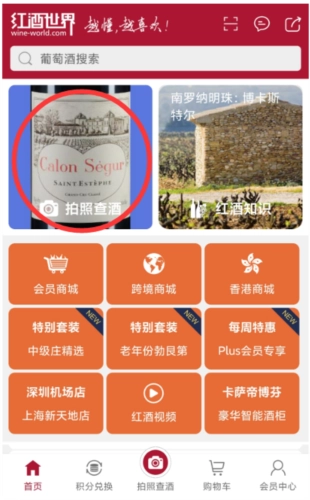 1. 进入红酒世界,轻点左上角的“拍照查酒”模块。