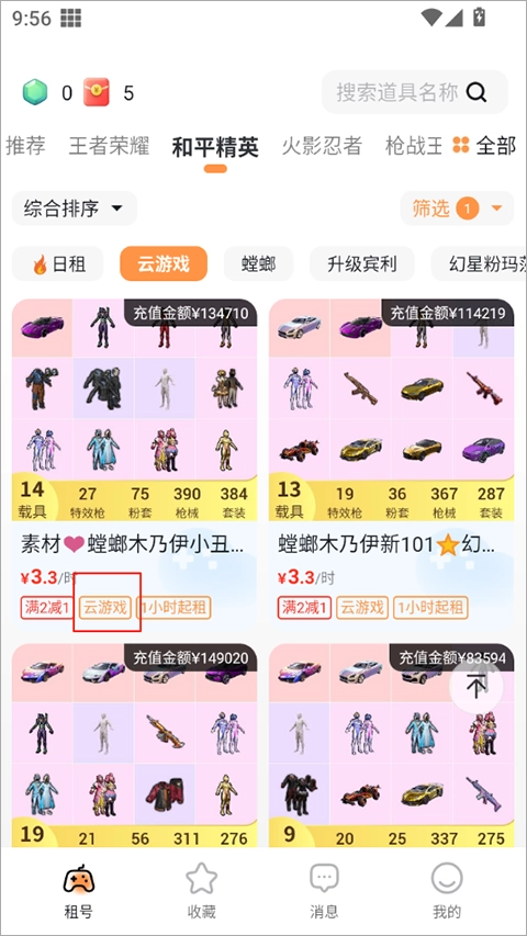 【特点】账号列表里有“云游戏”标签,当下平台仅部分《和平精英》账号可支持云游戏。