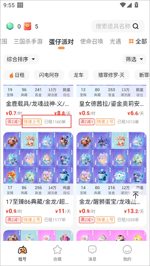 渴望拥有安心无忧的高级游戏账号体验?那就赶紧来租号宝!租号宝是一款专门为租号打造的软件,在这里,用户能够浏览到形形色色的游戏极品账号,像全皮肤的王者V10账号,还有拥有超多强力枪械皮肤与精美时装的和平精英账号等等,只有你想象不到的,没有这里找不到的。诚然,极品账号数量有限,价格也相对偏高,更多的还是普通账号,涵盖各类游戏,比如蛋仔派对、金铲铲之战、第五人格等。而且,在租号宝租号流程简便,交易安全有保障。