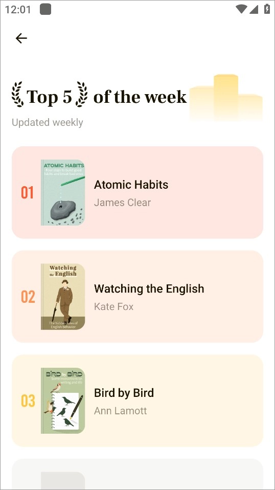 4、书籍榜单,提供周榜、月榜以及不同分类下的榜单