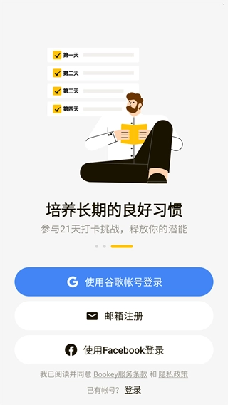 1、安装Bookey后,点击进入登录页面,App支持通过谷歌账号、邮箱进行登录。