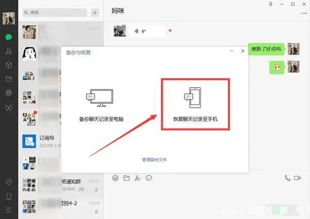 第二步:有两种模式可供选择,一是【恢复聊天记录至手机】 ,二是【备份聊天记录至电脑】。选择【备份聊天记录至电脑】这种方法,适合习惯在登录电脑微信时进行备份的人群,操作时需在手机上配合电脑一同完成,待手机操作结束后,在电脑上选取需要恢复的聊天记录就行。