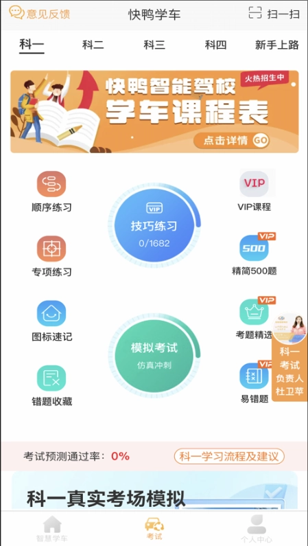 1. 打开快鸭驾考,进入软件首页。首次使用时,用户需注册并登录后才可使用。