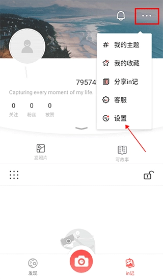 2、接着进入“in记”页面,点击页面右上角,在弹出选项中选择“设置”。