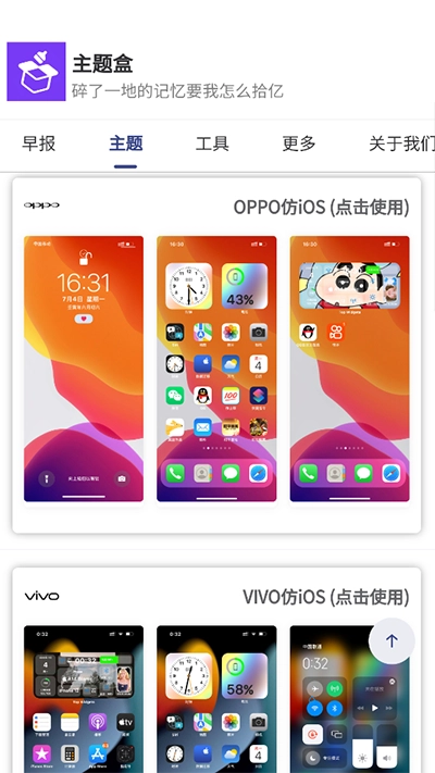 1、第一步,打开主题盒。在首页,能看到有诸多仿ios的手机型号主题可供使用。