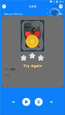 2、点击认生词,多次播放音频进行跟读,随后使用麦克风录制自己的发音,应用将依据你的发音给出评分。