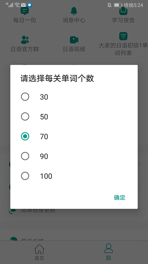 5、在设置界面,设有学习报告、单词本、课本收藏、口语圈等栏目。在此界面,我们不仅能选择单词库的类型,还能设定单词个数。以上便是日语的使用教程。