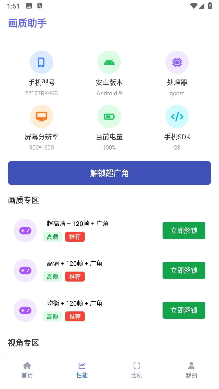 3. 在性能页面,同样支持一键开启超广角功能。