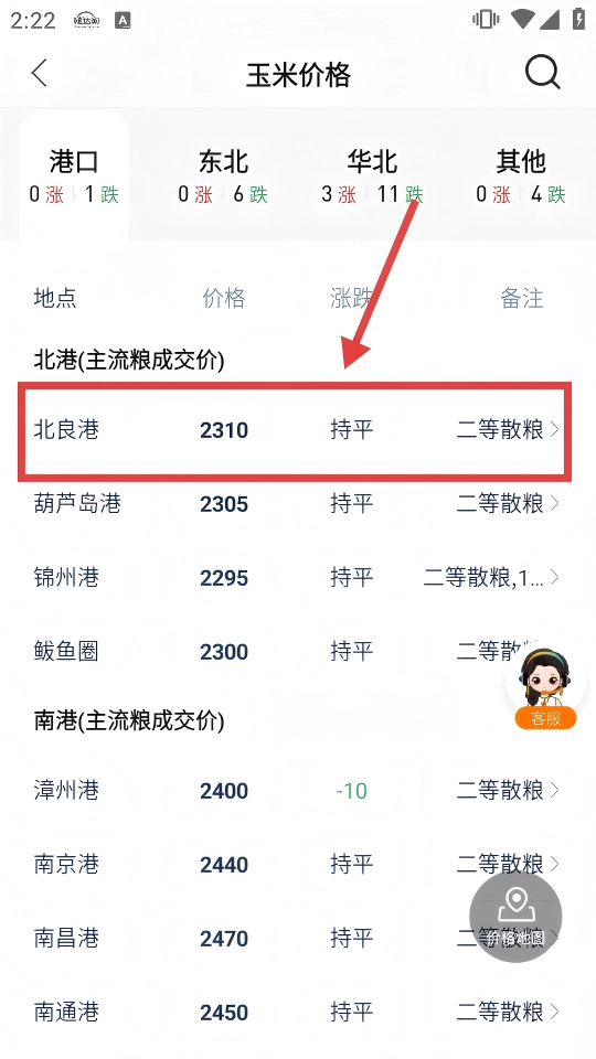 3、在玉米价格详情页面,选择目标港口(如北良港),查看该港口玉米价格及涨跌情况。
