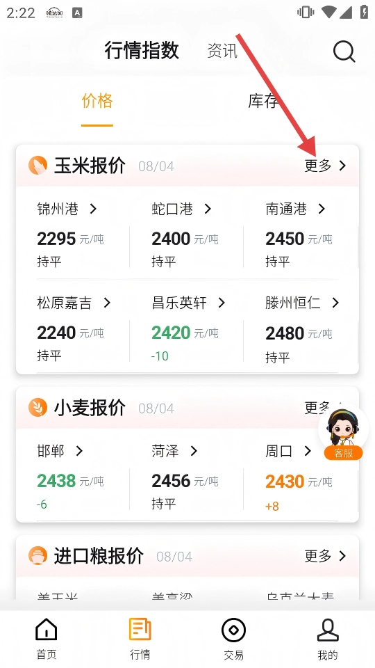 2、在行情指数页面,找到【玉米报价】板块,点击其右侧的【更多】,进入玉米价格详情页面。