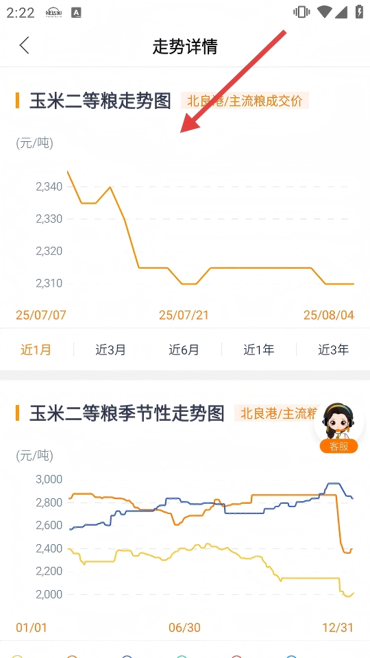4、点击目标港口对应的价格条目,进入走势详情页面,查看玉米价格走势图及季节性走势图等详细数据。