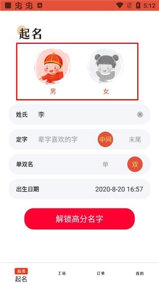 2、这款软件的操作十分简便,仅需在线填写宝宝的姓氏、出生年月以及性别即可。