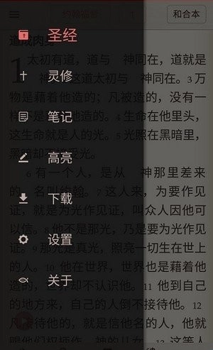 点击首页左上角,用户可以看到圣经、灵修、做笔记和设置等选项。