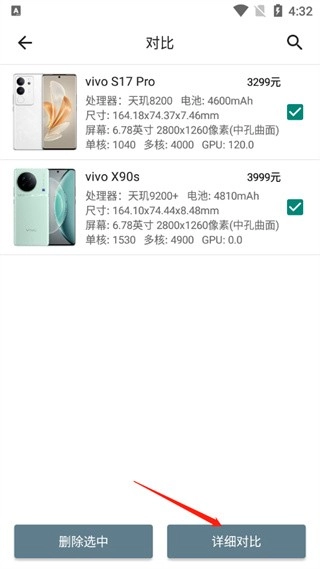 3、同时我们还可以进行对比,选择两款手机之后点击【详细对比】;