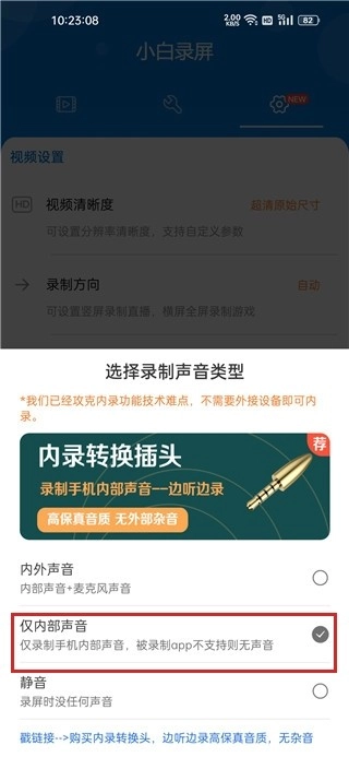 2、音质设置方面,可选择内外声音、麦克风、内部声音、静音等模式,能对麦克风音量与内部声音音量进行分别调节,还支持设置采样率以及立体声录制功能。