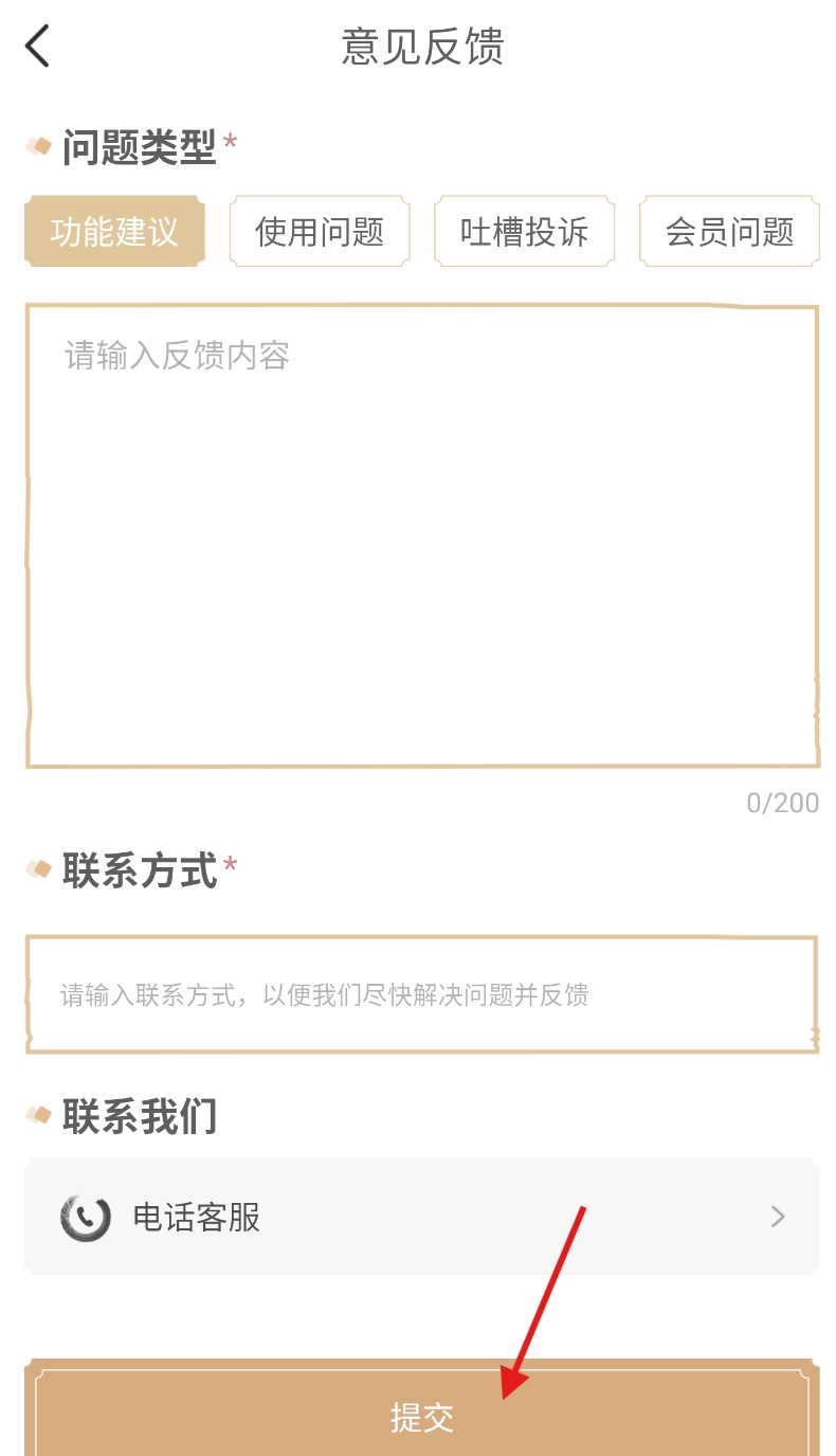 3、进入反馈页面后,选择对应的反馈类型,详细填写意见内容和联系方式,确认信息无误后点击提交按钮。
